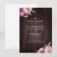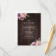 Vattenfärg botanisk blomsterdesign i lila, mullbär, dammros och persikofärg på mörk lada trästrukturbakgrund, med modernt skrivstil och text, elegant och stilfull, fina bröllopskort för rustika botaniska trädgårdsbröllop under höst och vinter.