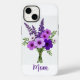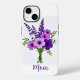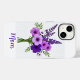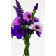 En bukett av lila blommor, inklusive lavender och olika petunier, arrangerad med grönt och löv. Blommorna visningar olika nyanser av lila och skapar en vibrerande och färglös sammansättning mot en genomskinlig bakgrund.