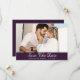 Elegant lila bröllop-fotot sparar datumkorten med ett förlovning-foto och ett skript på lila. Personlig lila bröllop spara datum kort. Anpassade lila bröllop spara datum kort. Skriptkort i bröllop spara datum.