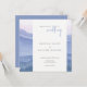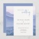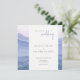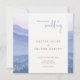 Bröllopsinbjudan med morgonlandskapet. Mjukhet - blått naturlandskap. Silhouettes från berg och dandelionblommor. Bröllbjudan för målning av vattenfärg. Lila Mountains Collection.