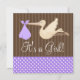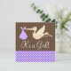 En söt lila och brun flicka baby shower inbjudan. Med en stork som bär en lila bunt. Trendigt och modernt - Anpassa enkelt för din baby shower!