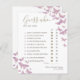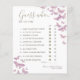 Lila- och guld-fjärilar, handritade i vattenfärg och lagrade digitalt med guld och sparkler (det här är INTE riktig folie!) dekorerar denna enkla och elegant, boho chic anpassningsbar möhippa "Gissa vem.."-spelkort med modern manusgrafi. Anpassa den till fullo, med bridens namn, datum och var och en av de tio frågorna.