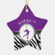 Vild zebra tryck figur skriker julprydnad i lila. En silhuett i en skater i figur ligger inuti en cirkel och det finns en "polka-dot"-banderoll för kontrast. Lägg till din egen namn före beställning! använda dessutom knappen "anpassa" för fler alternativ, inklusive ett annat teckensnitt!