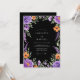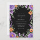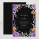 Denna design har en slående svart bakgrund som låter det livfulla blomsterarrangemanget sticka ut. Rika lila rosor och ömtåliga lavendlar kvistar paras med ljusa orange blommor och frodiga gröna blad. Stämningen är dramatisk och sofistikerad, perfekt för en kvällsfest. Vattenfärg-stilen lägger till en touch av konstnärlig elegans till den botaniska gränsen.