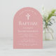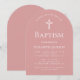 En enkel, minimalistisk dopinbjudan för flicka. Den har endast vit text på dammig rosa (rosa) bakgrund. I den övre delen finns ett kors med välvd text ovanför.