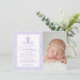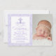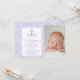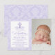 Flickors lila dopinvitation med lila pärlkors och elegant skrivstil på en vacker lila damaskhynklig bakgrund. Denna eleganta lila dopinvitation kan enkelt anpassas för din fest genom att helt enkelt lägga till dina uppgifter i den typsnittsstil och färg, samt formulering du väljer.