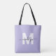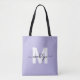 Personlig söt lila och vit trendig modern initialmonogram handväska. Lägg till en mjuk och feminin touch till din vardagliga stil med denna snygga och lekfulla handväska. Med en lila bakgrund och en djärv vit initial (utan glimmer eller folie), i par med ett snyggt svart namn i script-stil, blandar denna tote söt elegans med en fräsch, modern känsla. Med en ren design på båda sidor är den perfekt för att bära dina nödvändigheter till skolan, jobbet eller en rolig dag ute. Perfekt för systrar i en systerförening, brudtärnor eller som en rolig present till en möhippa, är denna handväska också en fantastisk present till födelsedagar, högtider eller någon speciell tillställning. Stilren, funktionell och full av