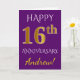 Denna enkla, personliga gratulationskortdesign för bröllopsjubileum har meddelandet "GRATTIS PÅ 16-ÅRSJUBILEUM", där "16:e" har ett utseende som liknar falskt guld. Framsidan har också ett personligt namn och en lila bakgrund. Insidan har ett anpassat gratulationsmeddelande för bröllopsjubileum. Det kan ges till en make eller maka för att fira parets sextonårsjubileum. [~Z0000089]