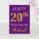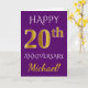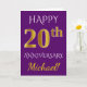 Denna enkla, personliga gratulationskortdesign för bröllopsjubileum har meddelandet "HAPPY 20th ANNIVERSARY", där "20th" har ett falskt guldliknande utseende. Framsidan har också ett personligt namn och en lila färgad bakgrund. Insidan har ett personligt gratulationsmeddelande för bröllopsjubileum. Det kan ges till en make eller en maka för att fira parets tjugoårsjubileum.