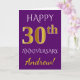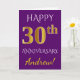 Denna enkla, personliga gratulationskortdesign för bröllopsjubileum har meddelandet "HAPPY 30th ANNIVERSARY", där "30th" har ett falskt guldliknande utseende. Framsidan har också ett personligt namn och en lila bakgrund. Insidan har ett anpassningsbart gratulationsmeddelande för bröllopsjubileum. Det kan ges till en make eller en maka för att fira parets trettioårsjubileum.