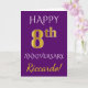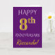 Denna enkla, personliga gratulationskortdesign för årsdagar har meddelandet "LYCKLIG 8-ÅRS DAGSHÖGTID", där "8:e" har ett utseende som liknar falskt guld. Framsidan har också ett personligt namn och en lila bakgrundsfärg. Insidan har ett anpassat gratulationsmeddelande för årsdagen. Det kan ges till en make eller maka för att fira parets åttonde årsdag. [~Z0000089]