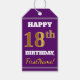 Den här märkrn med födelsedagspresent innehåller ett meddelande som "LYCKLIG 18:e BIRTHDAY, FirstName!", där namn kan vara personlig och där siffran "18:e" har ett utseende som påminner om guld/imitation färg. På framsidan finns också en bakgrund för färgaden lila. Baksidan har en Från:-linje. Märkre av födelsedagspresent som dessa skulle kanske kunna användas för gåvor som ges till någons artonde födelsedag. [~Z0000212]