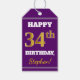 Den här märkrn med födelsedagspresent innehåller ett meddelande som "LYCKLIG 34:e BIRTHDAY, Stephen!", där namn kan vara personlig och där siffran "34:e" har ett utseende som liknar guld/imitation färg. På framsidan finns också en bakgrund för färgaden lila. Baksidan har en Från:-linje. Märkre av födelsedagspresent som dessa skulle kanske kunna användas för gåvor som ges till någons trettiofjärde födelsedag. [~Z0000212]