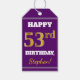Den här märkrn med födelsedagspresent innehåller ett meddelande som "LYCKLIG 53:e BIRTHDAY, Stephen!", där namn kan anpassas och där siffran "53:e" har ett utseende som liknar guld-liknande färg. På framsidan finns också en bakgrund för färgaden lila. Baksidan har en Från:-linje. Märkre av födelsedagspresent som dessa skulle kanske kunna användas för gåvor som ges till någons femtiotredje födelsedag. [~Z0000212]