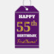 Den här märkrn med födelsedagspresent innehåller ett meddelande som "LYCKLIG 55:e BIRTHDAY, FirstName!", där namn kan vara personlig och där siffran "55:e" har ett utseende som påminner om guld/imitation färg. På framsidan finns också en bakgrund för färgaden lila. Baksidan har en Från:-linje. Märkre av födelsedagspresent som dessa skulle kanske kunna användas på gåvor som ges till någons femtiofemte födelsedag. [~Z0000212]