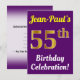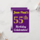 Födelsedagsfest inbjudan har ett budskap som "Jean-Paul’s 55:e födelsedagshälsningen!", där namn kan vara personlig och där siffran "55:e" har ett utseende som liknar guld. Den har också en bakgrund för färgad av lila. Händelseinformationen på baksidan kan anpassas. Det skulle kunna användas för människor i inbjudan till någons femtiofemte födelsedag eller födelsedagsfest. [~Z0000121]