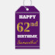 Den här märkrn med födelsedagspresent innehåller ett meddelande som "62:a BIRTHDAY, Samantha!", där namn kan vara personlig och där siffran "62:a" har ett utseende som påminner om guld och liknande färg. På framsidan finns också en bakgrund för färgaden lila. Baksidan har en Från:-linje. Märkre av födelsedagspresent som dessa skulle kanske kunna användas på gåvor som ges till någons sextioårsdag. [~Z0000212]