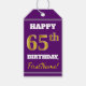 Den här märkrn med födelsedagspresent innehåller ett meddelande som "LYCKLIG 65e BIRTHDAY, FirstName!", där namn kan anpassas och där talet "65e" har ett utseende som liknar faux/imitation guld-liknande färg. På framsidan finns också en bakgrund för färgaden lila. Baksidan har en Från:-linje. Märkre av födelsedagspresent som dessa skulle kanske kunna användas på gåvor som ges till någons sextiofemårsdag. [~Z0000212]