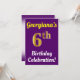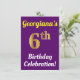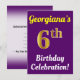 I födelsedagsfest inbjudan finns ett budskap som "Georgianas 6e Birthday Celebration!", där namn kan vara personlig och där "6e" har ett faux guld-liknande utseende. Den har också en bakgrund för färgad av lila. Händelseinformationen på baksidan kan vara personlig. Den skulle kunna användas för inbjudan till någons sjätte födelsedag eller födelsedagsfest. [~Z0000121]