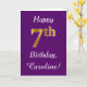 Den här enkla födelsedagskortsdesignen innehåller meddelandet "Lycklig 7:e födelsedag", där "7:e" har ett utseende som liknar guld. Den har också en personlig namn och en lila bakgrund. Det skulle kunna ges till någon som firar sin sjunde födelsedag.