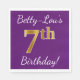Den här enkla pappra napkin-designen innehåller ett meddelande som "Betty-Lous 7:e Birthday!", där "7:e" har ett utseende som liknar guld, på lilans färgad. Namn kan anpassas. Den skulle kunna användas i en födelsedagsfest till någon som firar sin sjunde födelsedag. [~Z0000085]