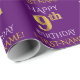 Den här pappra designen innehåller ett meddelande som "LYCKLIG 9:e BIRTHDAY", där "9th" har ett utseende som faux/imitation guld. Den har också en namn som kan vara personlig och en lila färgad-bakgrund. Det kan kanske användas när man slår in presenter på någons nionde födelsedag. [~Z0000134]