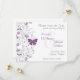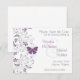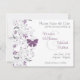 Denna eleganta och lekfullt romantiska "save the date"-inbjudan har en design med en grå gren kantad med lila blommor och en lila fjäril. Texten är skriven i grått med brudens och brudgummens namn i ett matchande lila som passar färgen på fjärilen och blommorna. (Detta lila kan också kallas orkidé, viol eller druva.) Den här inbjudan skulle passa bra för en sensommar- eller höstbröllop och skulle även kunna anpassas till en årsdagsfest eller en brudkvällsinbjudan.