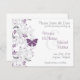 Denna eleganta och lekfullt romantiska "save the date"-inbjudan har en design med en lila blomsterkantad grå gren med lila fjäril. Texten är skriven i grått med brudens och brudgummens namn i ett matchande lila som passar till fjärilen och blommorna. (Detta lila kan också kallas orkidé, viol eller druva.) Den här inbjudan skulle passa bra för en sen sommar- eller höstbröllop och skulle också kunna anpassas till en årsdagsfestinbjudan eller en inbjudan till brudfest.