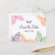 Delikata för hand skissade fjärilar i flykt pryder detta Spara datumet-kort. Detta är en del av den kompletta brölloppskollektionen Purple Butterfly Kisses. Det koordinerar lätt med brölloppskollektionen Heart's a Flutter eller kollektionen Butterfly Kisses.