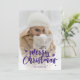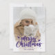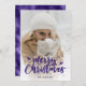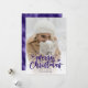 Anpassningsbar lila-fotojulkort med ett foto med övertäckning av snö och handskrivna skriptteckensnitt på framsidan och faux lila foil med snö längst bak. Anpassa enkelt de här lila fotojulkorten med din bild och text.