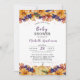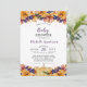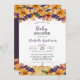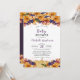 Den här inbjudan från Forest Rustic Baby Shower hösten blåser den rustiska orangen och vilden, skogsskon och löv, lite pumpa och gulddroppar. Baksidan är en rik mörk lila färg med höstblommor.
