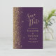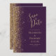 Det moderna bröllop spara datum-kortet från elegantens lämnat kant har ett guld faux glitter gräns. Anpassadet kombinerar handskrift, rityta och kursivt typsnitt i blek guld-färgad med mörkens lila. Den omvända sidan har en matchande lila- och guld-design.