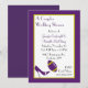 Rolig bröllopsinbjudan för par i lila, guldton och vitt. Grafik med en lila och guld ram runt ett vitt textfält, med en lila stiletto som sparkar en lila, guld och vit fotboll. Svart och lila text är helt anpassningsbar för att anpassas till er bröllopsfest. Perfekt för paret som älskar fotboll.