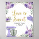 Lila fyll köket bröllopsfest Love is Sweet skylt