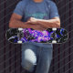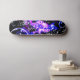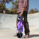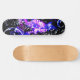 En dekorativ rymdgrafik med en lila färgad i rymden nebuli där planeter och måne kommer från svart utrymme på en skateboard.