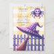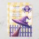 Firar din lilla boo med den här charmerande halloween-babyduschdesignen! Med en mysigt gingham-bakgrund, en lila häxhatt, träbroom och en buggbunden spindel som hänger över ett betesstängsel, blandar den här inbjudan pooky med söt på alla höger. Perfekt för en party-fullt i höst med värme och magi.
