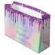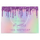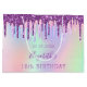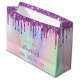 En presentväska för en gigantisk och glamorös 21:a (eller någon ålder) födelsedag. En enhörnig, regnbågsbakgrund med faux glitter-droppar, färgdroppsutseende i rosa och lila. Anpassa och lägg till ett datum, namn och 21 år. Texten: namn är skrivet i lila med ett modernt handskript i stil.
