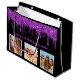 För en 50:e (eller någon annan ålder) födelsedag. En svart bakgrund för eleganten. Med lila faux glitter droppar, färgdroppar. Anpassa och lägg till 3 av dina egna foton, ett datum, namn och 50 år. Lila text. Namn är skrivet med ett modernt handskript i stil.