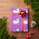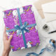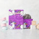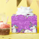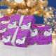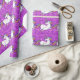 En färgstark, glatt lila enmajsförpackning papper med en mönster av söta små knubbig som förenar sig med regnbåge, färgad hår, mane och svan, guld stjärnor på deras kroppar och gyllene hovar. De dansar över en glittrande lila bakgrund av mousserande glitter. Detta lila enmajsskrot skulle vara idealiskt för ett barns födelsedagsfest, för enmajshantverk och mycket annat.