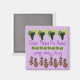 Dishwasher magnet har en rad druvor utan druvor på dem, med ord "Dirty! Tvätta!" på ena kant och vänd om den, och det finns en rad rena färska druvkluster av lila med ord "Rengör! Snälla, lägg av!" på motsatt kant. Har en rad löv i mitten som delare. Bakgrunden är ett mycket litet schaktat mönster i lila och vitt.