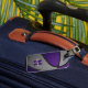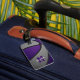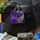 Den här basketresemaggen som är lämplig för en pojke eller flicka har en abstrakt överdimensionerad basketboll med omväxlande lila- och grått-paneler, som du kan anpassa med idrottsmannens namn och monogram på framsidan - anpassa adress och det mobila numret på baksidan - av katz_d_zynes