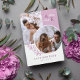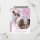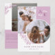 Dubbel sidig spara datum-kort i vitt och lila med era initialer, överlappande bilder och grönska med rena eleganta typsnitt. Foto spara datum-kort med en modern design anpassad med er monogram och bilder, två på ena sidan och en på den andra.