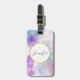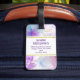 En bagagemärke med en vacker konstnärlig målning. Skapat med flytande bläck. Lila, grönt och blått färg som flyter samman. Tunt vågigt rosett band i guld blandat med dessa mjuka, mjuka färg.
