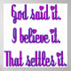 Lila bokstäver lyder, "Gud sa det. Jag tror på det. Det avgör det." Hjärtan pryder prickarna över i:et. Roligt sätt att visa din kärlek till din religion och din tro på Gud. Lysande present vid bröllop, prästvigning, dop, första kommunion, konfirmation och alla heliga dagar. Underbart även till jul, påsk och födelsedagar.