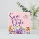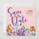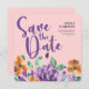 Lila gula blommor Spara datumfunktionen rundade blommor från ram med snyggt vattenfärg. Vattenskärtskhet och grönt för ditt kreativ och helig bröllop. Rosa version Spara datum.