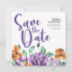 Lila gula blommor Spara datumfunktionen rundade blommor från ram med snyggt vattenfärg. Vattenskärtskhet och grönt för ditt kreativ och helig bröllop. Vit version Spara datumet.