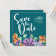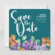 Lila gula blommor Spara datumfunktionen rundade blommor från ram med snyggt vattenfärg. Vattenskärtskhet och grönt för ditt kreativ och helig bröllop. Tosca-versionen Spara datumet.