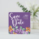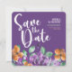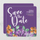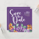 Lila gula blommor Spara datumfunktionen rundade blommor från ram med snyggt vattenfärg. Vattenskärtskhet och grönt för ditt kreativ och helig bröllop. Lila version Spara datum.