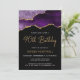 Denna eleganta 90-års födelsedagsinbjudan har en akvarellbild av en agatgeod i lila nyanser med falska guldglittereffekter. Orden "90-årsdag" visas i guldliknande modern handskrift. Anpassa den med namnet på hedersgästen i guldliknande text och detaljerna i vitt på svart bakgrund. En matchande lila och guld agat-design visas på baksidan.
