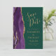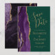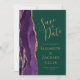 Det moderna bröllop spara datum-kortet från elegantens lämnat kant har en lila vattenfärgsagat gräns som trimmas med faux guld glitter. Anpassadet kombinerar handskrift, rityta och kursivt typsnitt med guld-färgad på en bakgrundsbild av grönten. Den omvända sidan har en matchande lila- och guld-agate-design.